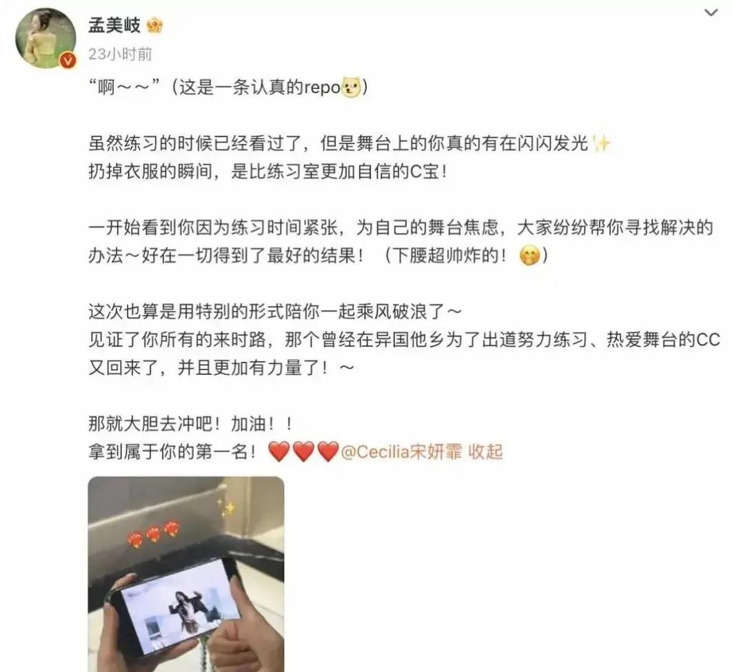 后脚孟美岐就为宋妍霏打call,祝她拿下属于自己的第一名。
